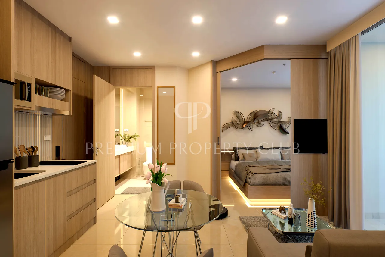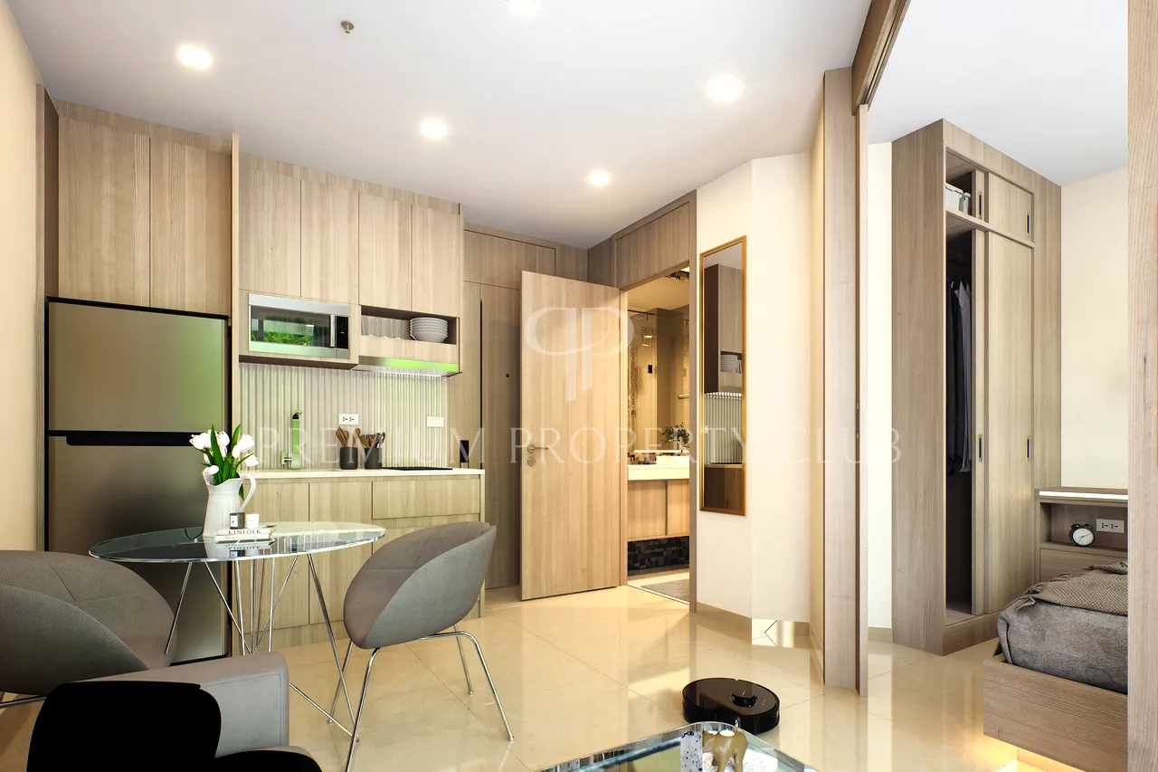 Experience modern comfort in this elegantly designed one-bedroom apartment at Harmonia City Garden Pattaya. With 26.5 sqm of thoughtfully planned space, this unit is perfect for individuals or couples seeking a stylish urban retreat. The apartment features a spacious living area, a well-equipped kitchenette, and a cozy bedroom with large windows that invite natural light.
